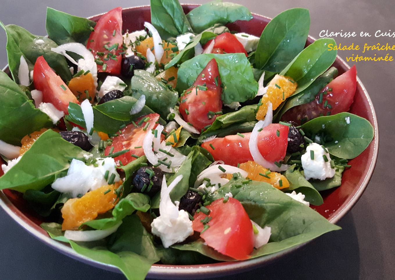 - Dans un plat creux, déposer : les feuilles d'épinards + répartir les filets d'orange + disposer les quartiers de tomates + 8 olives noires dénoyautées + 2-3 tranches de feta coupées en petits dés + les lamelles d'oignon + la ciboulette ciselée.