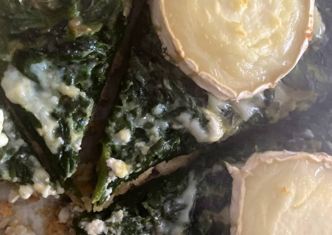 - Éplucher et couper finement les oignons, les faire revenir à la poêle avec de l’huile d’olive, ajouter les épinards et assaisonner