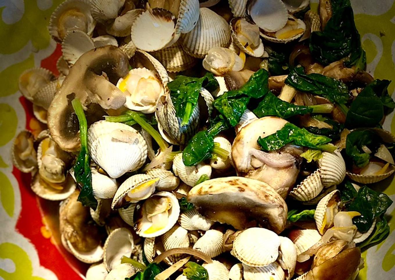 - Quand tout a réduit, on ajoute également les coques. On monte le feu à 6-7 et on recouvre le wok pendant 6-7 minutes.