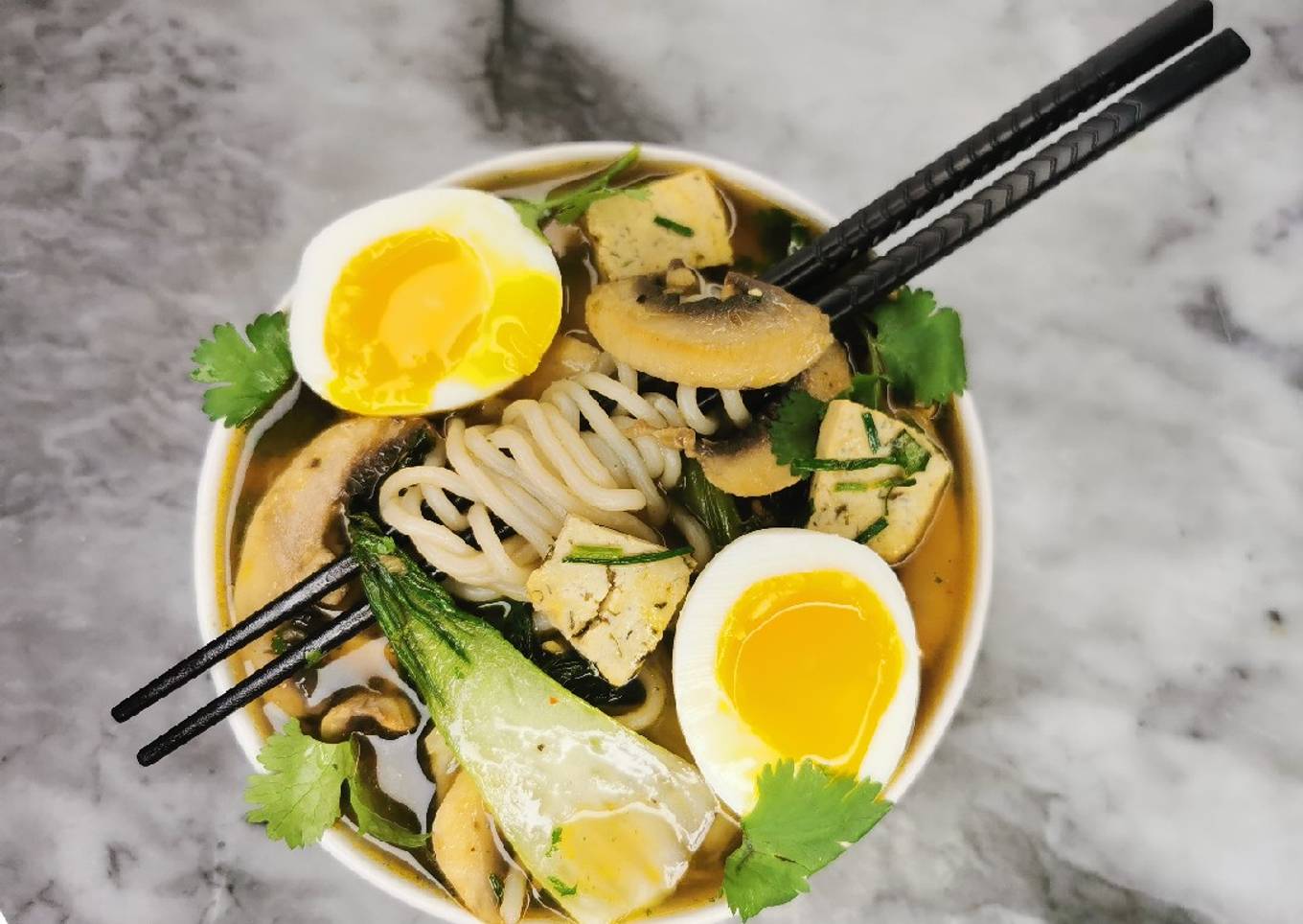 - Dans un bowl, versez les nouilles et les légumes puis verser du bouillon dessus et rajouter l'œuf coupé en deux.