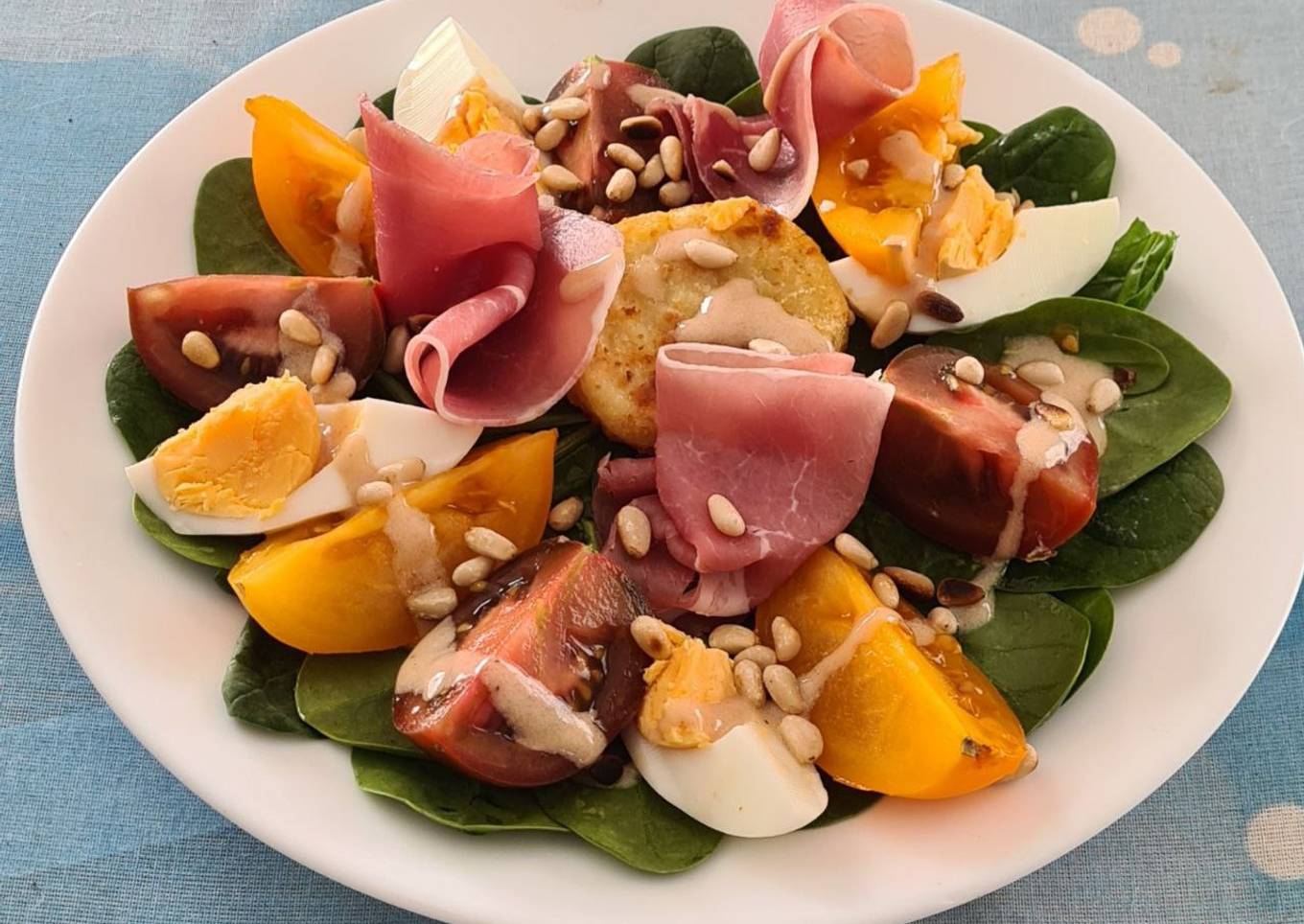 - Déposer les röstis au centre des assiettes et disposer les tranches de jambon cru autour
