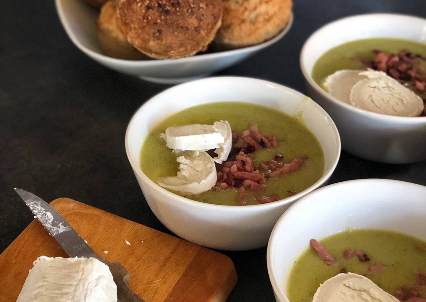 - Servir la soupe en y déposant les lardons et quelques tranches de chèvre