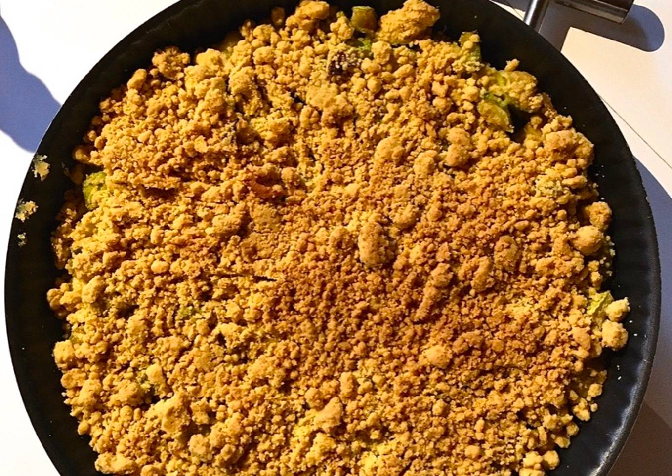 Dans un plat qui va au four, mettre les courgettes et la pâte à crumble par-dessus. Faire cuire à 200• pendant 15 min. Puis 10 min à 180• C’est prêt à être dégusté 🍴 vous pouvez accompagner cette recette d’une salade verte !!!