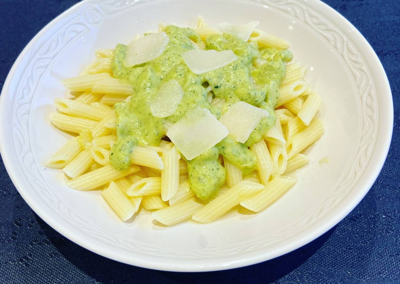 Rectifiez l’assaisonnement si besoin. - Dressez une assiette, mettre les pâtes, la crème de courgette et le parmesan.